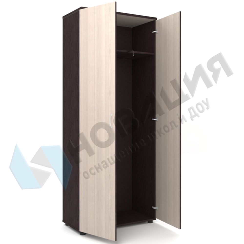 Шкаф для одежды размещается в кабинетах ДОУ, школ, прочих муниципальных учреждений. Наличие полок для головных уборов и обуви, наличие выдвижной поперечной штанги для верхней одежды делают такой предмет мебели соответствующим своему функциональному назначению. Опоры шкафа регулируются.