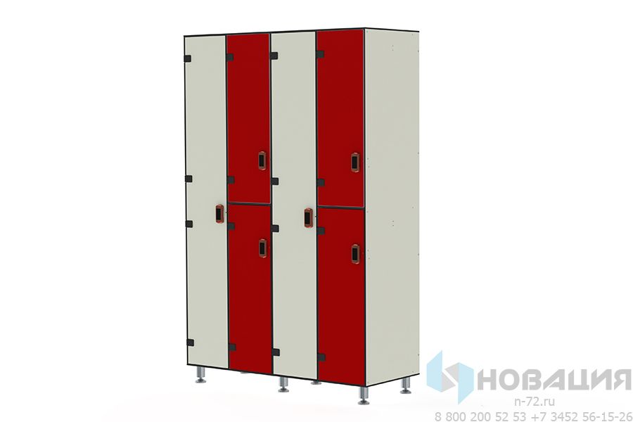 2 секции из 4-х делятся горизонтальной перегородкой на верхний и нижний ярус. Каждая ячейка оснащается полкой, крючком и дверцей на механическом замке. 2 другие секции представлены одним ярусом, оборудуются штангой для вешалок, полкой, крючком и дверцей на механическом замке.