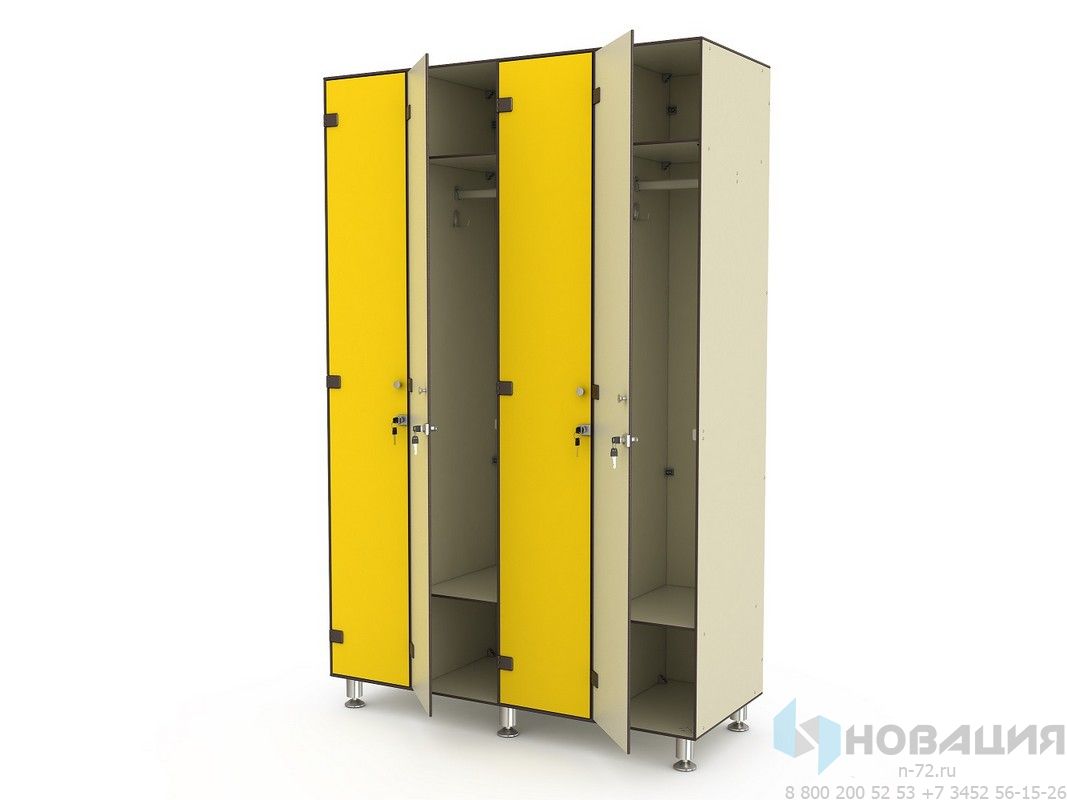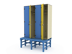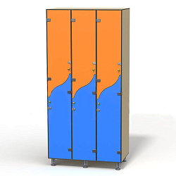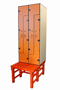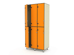 Изделие из пластика HPL подходит для хранения водного инвентаря и одежды. Каждая секция прямоугольного корпуса оборудуется верхней и нижней полками, крючком, штангой для вешалок и дверцей на механическом замке.