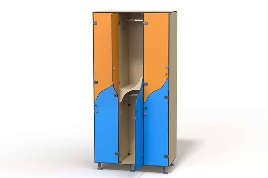 Изделие подходит для хранения водного инвентаря и одежды. Каждая из 3-х вертикальных секций оборудуется крючком, штангой для вешалок и дверцей на механическом замке.