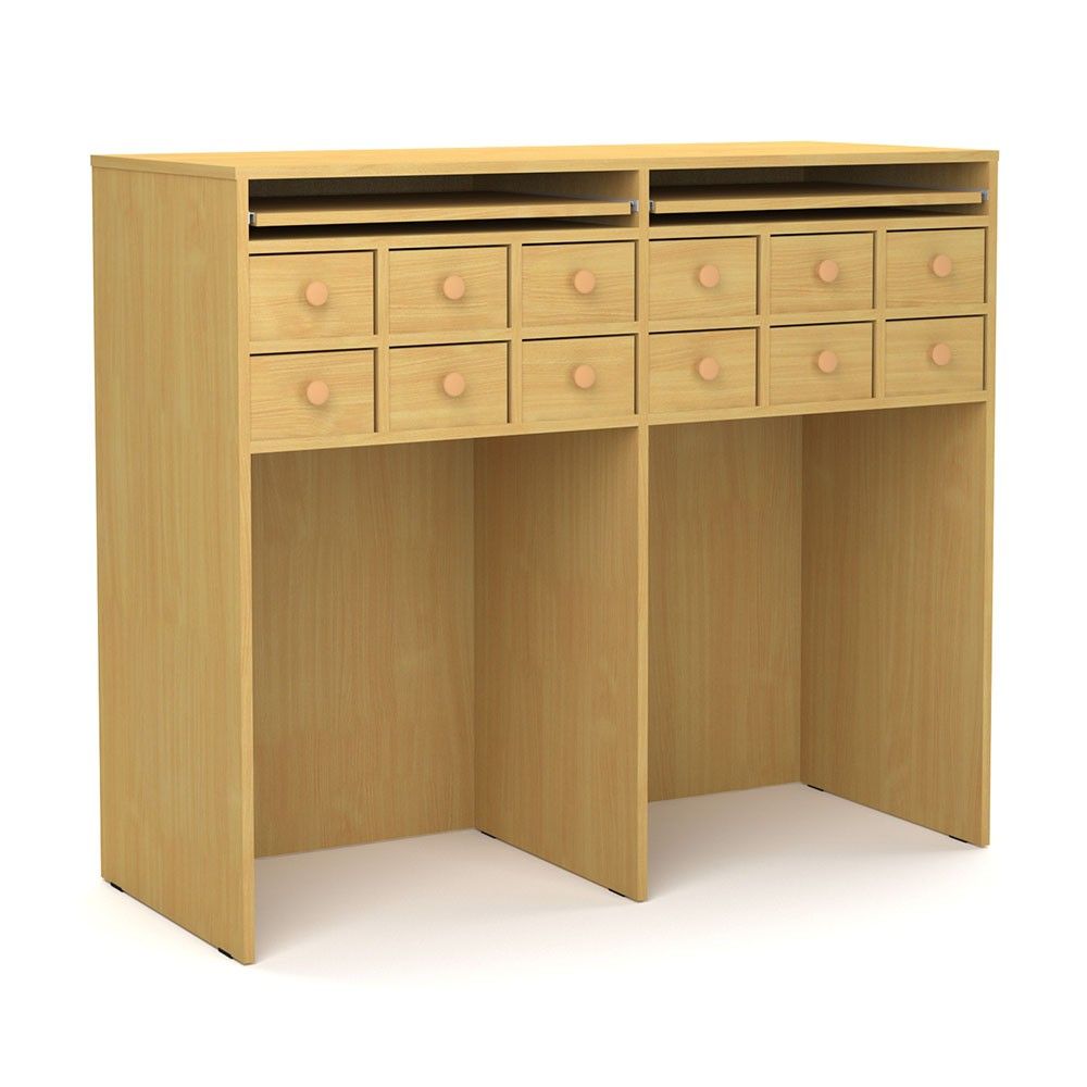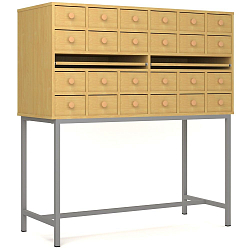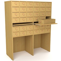 1-секционный шкаф для школьной библиотеки оснащается 2-мя рядами ячеек. Выдвижные ящики в количестве 12-ти шт. дополняются фурнитурой. Расположенные на одном уровне 2 полки выдвигаются над секцией для хранения и позволяют работать с содержимым картотеки.