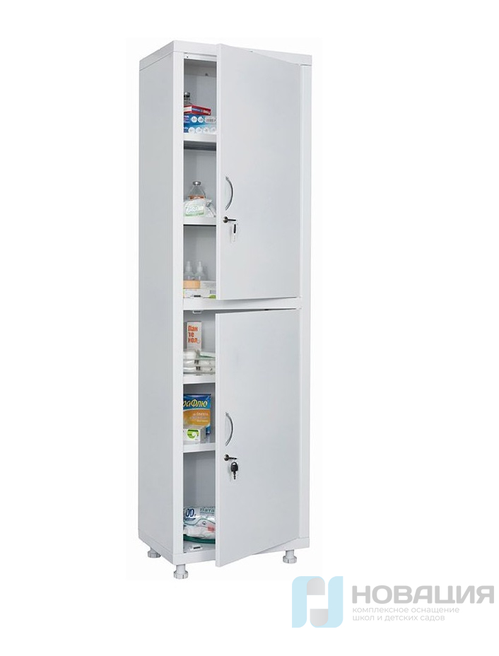 Металлический шкаф подходит для хранения медикаментов, инструментов, документов в медицинском или лабораторном кабинете.