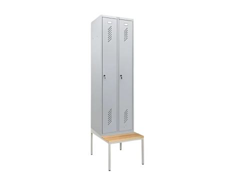 Шкаф с вентиляционными отверстиями состоит из двух секций. Комплектуется полкой и перекладиной с крючками. Поставляется с крепежом для сборки и ключевым замком. Несколько шкафов можно скреплять между собой.