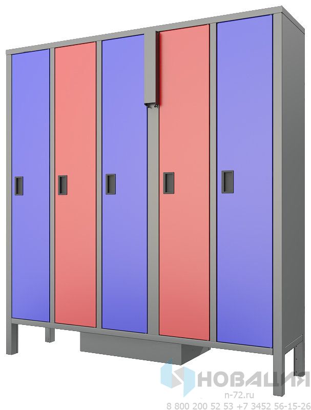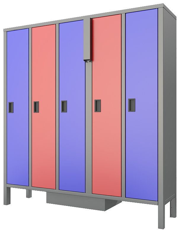 Прямоугольный корпус с цветными одностворчатыми дверями оснащается отдельными секциями, в каждой из которых по 2 полки. Отделения предназначаются для спортивной формы, аксессуаров, экипировки, головных уборов.