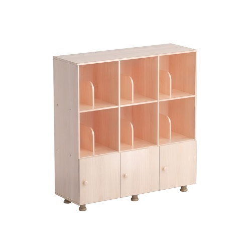 Шкаф состоит из девяти ниш - по 3 в каждом ряду. 3 ниши нижнего ряда оснащены дверками. Секции среднего и верхнего ряда открытые, в них установлена вертикальная перегородка. Шкаф размещается на шести регулируемых опорах, которые позволяют компенсировать неровности пола.