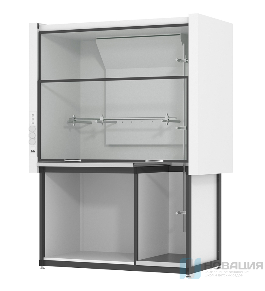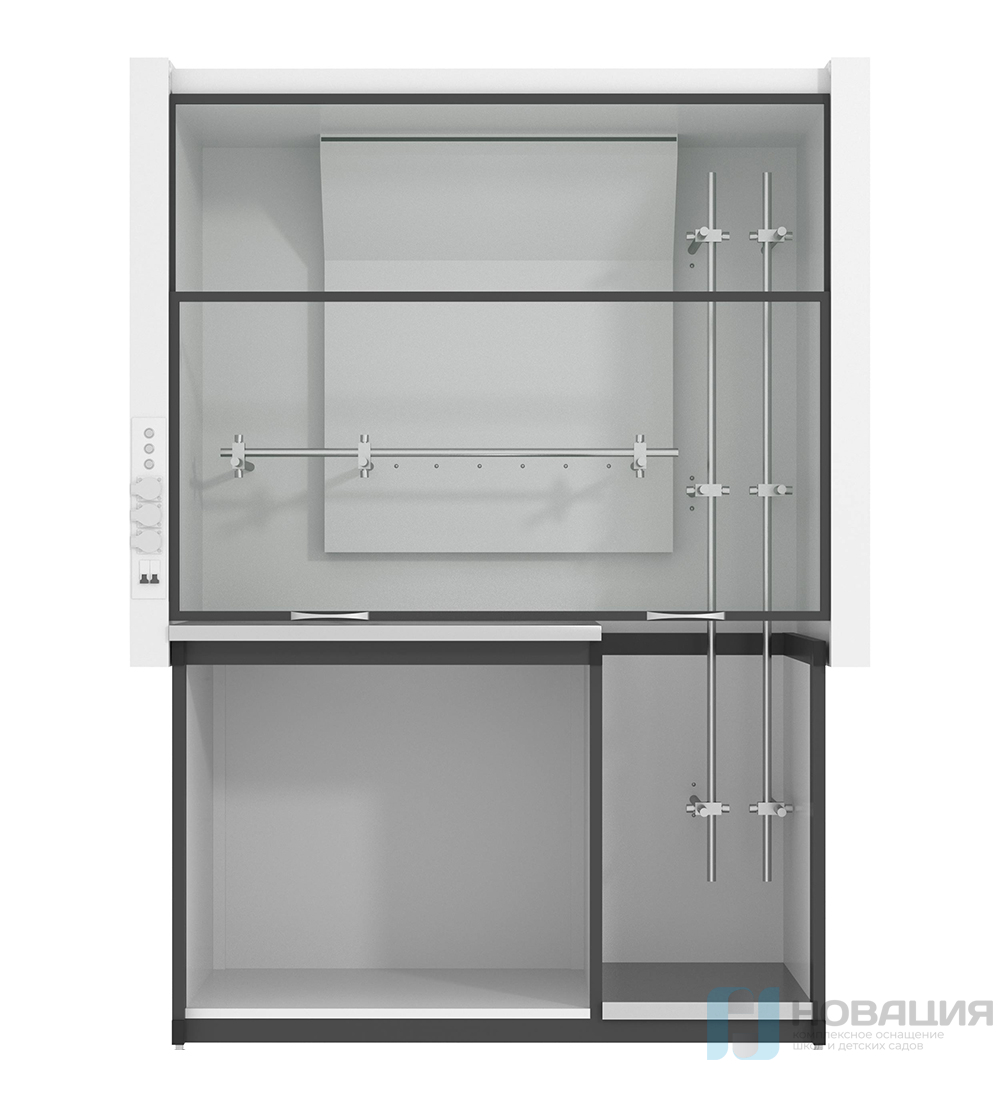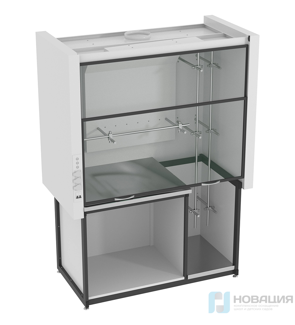 Шкаф оборудован светильником и съемным электроблоком. Светильник размещается в верхней части шкафа и состоит из четырех светодиодных ламп. Электроблок располагается вне области рабочей камеры на левом пилоне вытяжного шкафа и включает в себя автоматические выключатели для светильника и розеток, а также три силовые розетки и кнопочный выключатель со светодиодами.