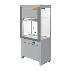Шкаф оснащен подъемным механизмом, который позволяет установить защитный экран из бронированного стекла на любой высоте. Вытяжка происходит даже при опущенном экране за счет зазора для притока воздуха. Воздушный поток разделяется на две части для отбора тяжелых и легких газов из нижней и верхней части рабочей камеры шкафа.