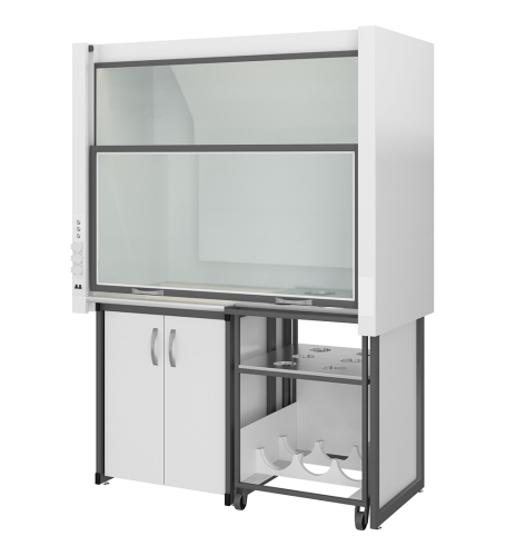 Шкаф оснащен подъемным механизмом, который позволяет зафиксировать защитный экран из бронированного стекла на любой высоте. Вытяжка происходит даже при опущенном экране за счет зазора для притока воздуха. Воздушный поток разделяется на две части для отбора тяжелых и легких газов из нижней и верхней части рабочей камеры шкафа.