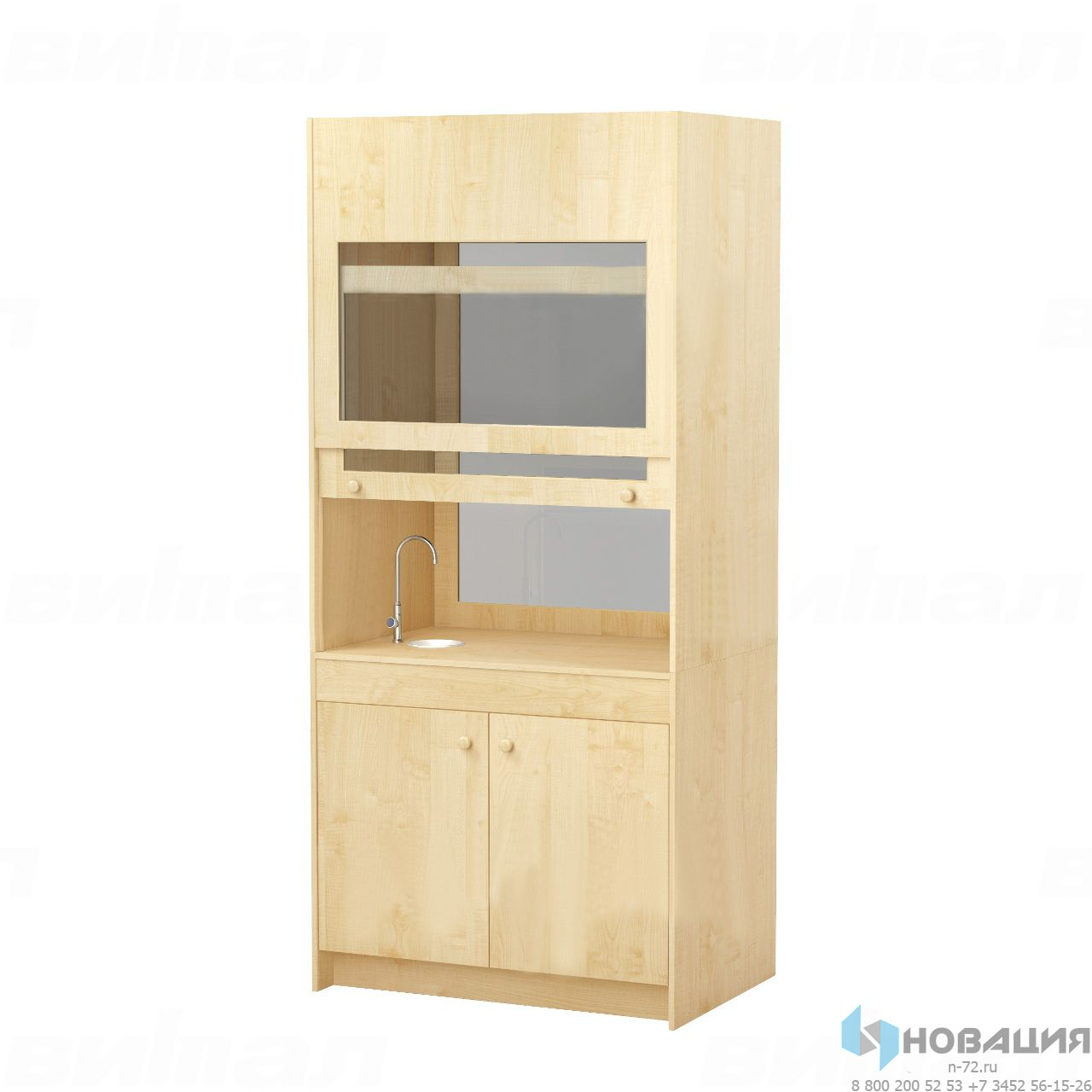 Вытяжной шкаф для школы оснащен водоразборной колонкой (краном), раковиной, тумбой с двумя дверцами и полкой внутри для хранения препаратов и инструментов. Используется в специализированных кабинетах, где проводятся лабораторные работы. Столешница изготовлена из ДСП с пластиковым покрытием, передний торец отделан противоударной кромкой.