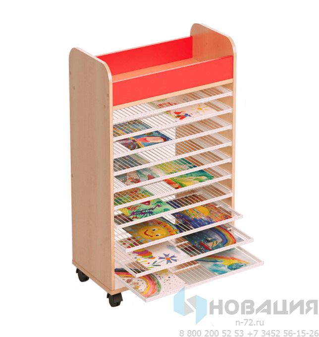 Прямоугольный каркас оснащается выдвижными полками, на которых сушатся и хранятся детские рисунки.