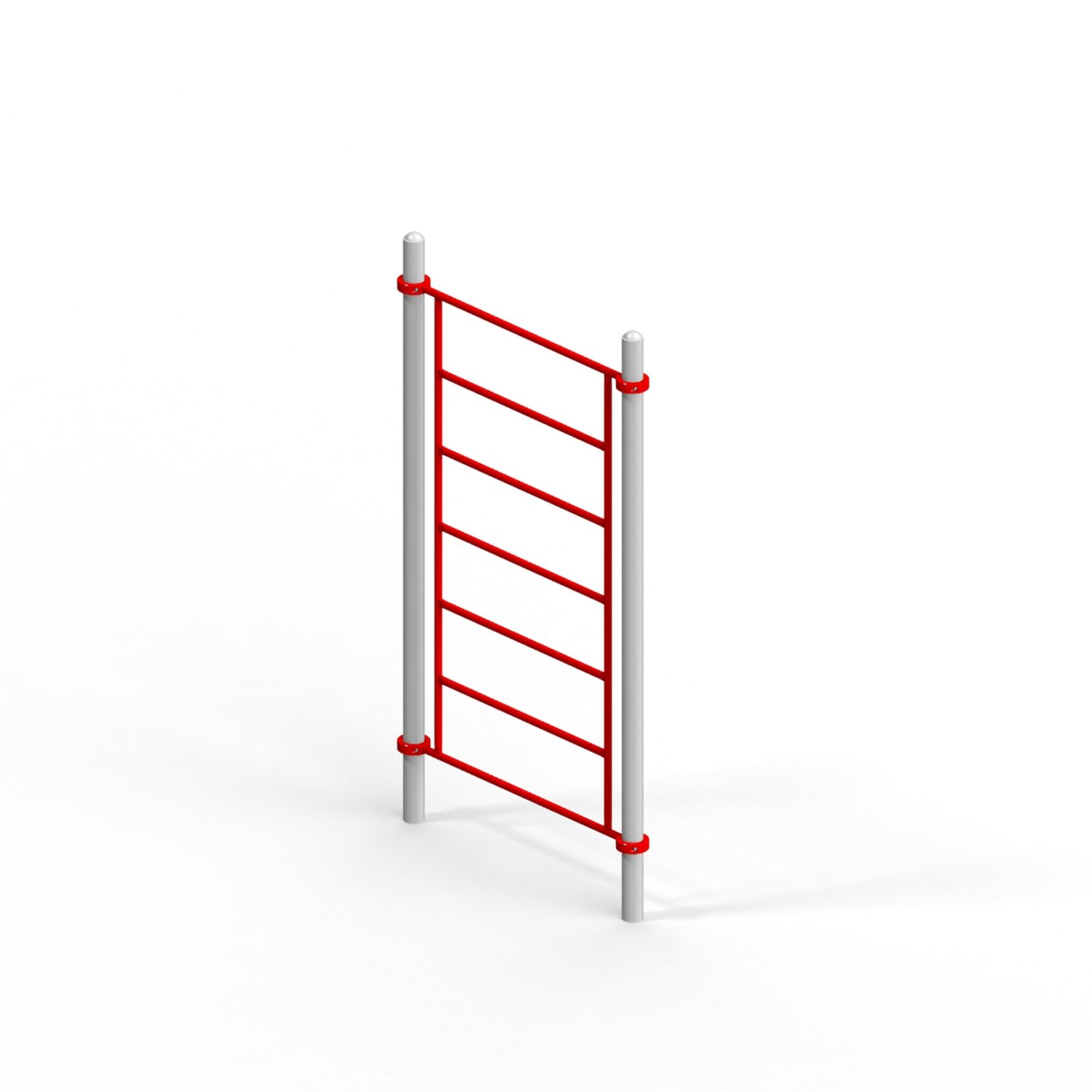 Между 2-мя стойками при помощи специальных хомутов фиксируется шведская стенка из металлических перекладин. d хомута 140 мм.