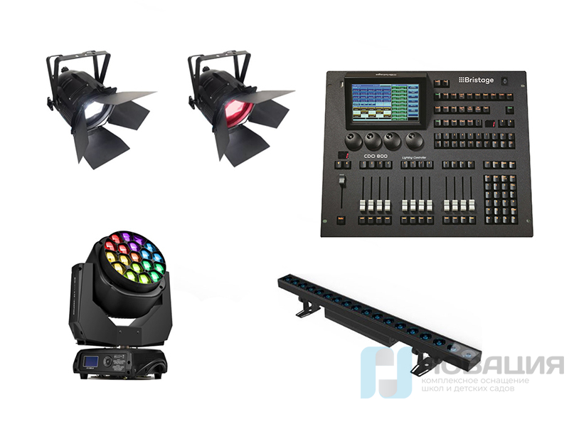 - 4 прожектора типа вращающаяся голова Wash с изменением цвета для эффектной контровой или верхней засветки сцены: индивидуальное управление каждым светодиодом, увеличением угла 4-60°, управление: DMX512/RDM, DMX каналы: 21/35/42/49, источник света: Osram 7x40W RGBW LED,