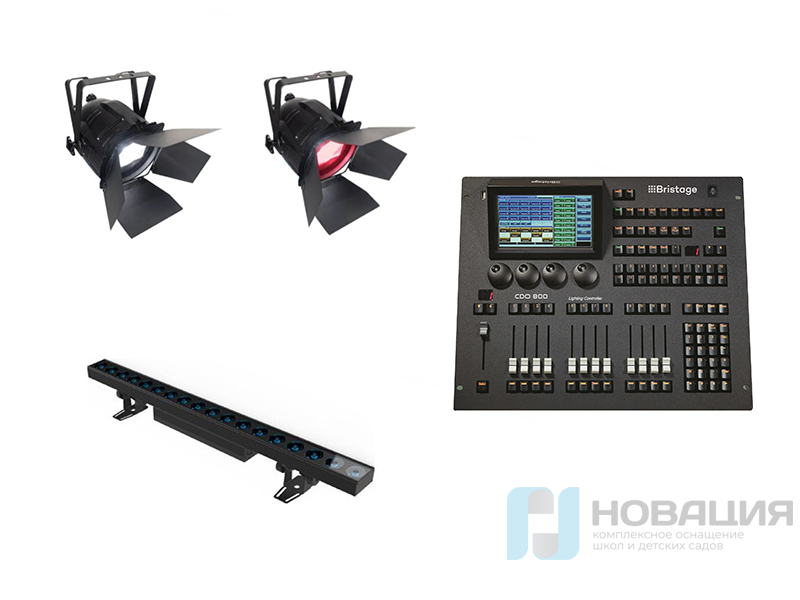 Набор содержит световые приборы и оборудование для управления ими. Рассчитан на помещения вместимостью до 50 человек.