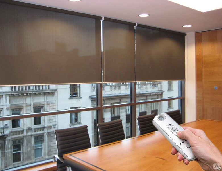 Электропривод управляется с помощью пульта, поэтому лишних усилий не требуется. Можно не вставая с места поменять степень естественного освещения. Мощность привода зависит от размеров проема, веса полотна. Двигатель питается от сети (220 В).