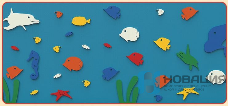 Скалодром состоит из трех секций размером 900х2000 мм. Каждая секция включает две панели. Упоры выполнены в виде рыб и морских животных. Крепления входят в комплект, допустимая нагрузка на скалодром 500 кг.