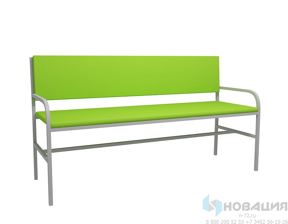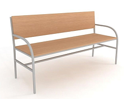 Скамейка для зон ожидания и переодевания состоит из металлического каркаса на 4-х опорах, поперечной перекладины, прямоугольного сиденья, прямоугольной спинки. Подлокотники (в первом варианте решения) образуют дугу и постепенно переходят в передние ножки. Между сиденьем и спинкой есть свободное пространство.