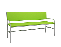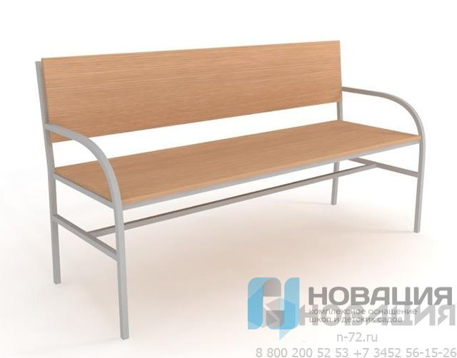 Скамейка для входной зоны состоит из металлического каркаса на 4-х опорах, поперечной перекладины, прямоугольного сиденья, прямоугольной спинки. Подлокотники (в первом варианте решения) образуют дугу и постепенно переходят в передние ножки. Между сиденьем и спинкой есть свободное пространство.