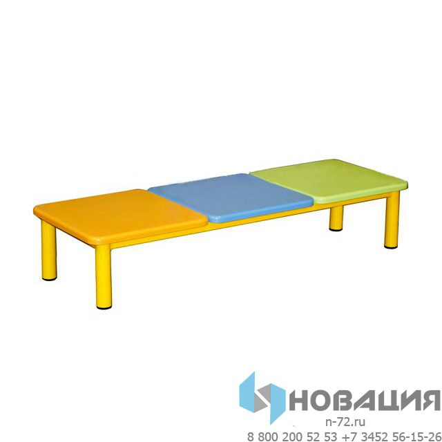 Детская скамья с закругленными углами ставится в раздевалке. Посадочные места держатся на каркасе с 4-мя опорами. Высота конструкции подстраивается под группу. Гардеробная мебель без спинки используется в детском саду, начальной школе, летнем лагере.
