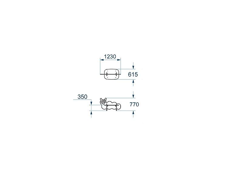 Корпус представлен фигурной панелью-спинкой с рисунком в виде гусеницы, по обе стороны от нее закрепляются сиденья со скругленными углами. Лавка вставляется в пазы 4-х фанерных опор, которые изображают ноги насекомого.