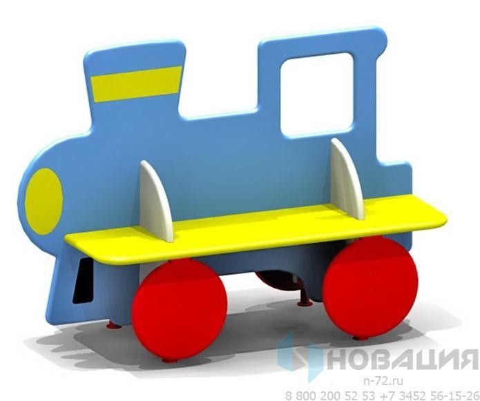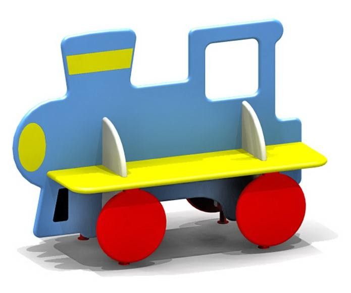 Скамья оформлена в виде паровоза. С 2-х сторон от перегородки-спинки расположены сиденья. Углы элементов закруглены. На опорах 4 накладки в форме колес. Детали соединяются с помощью пазов.
