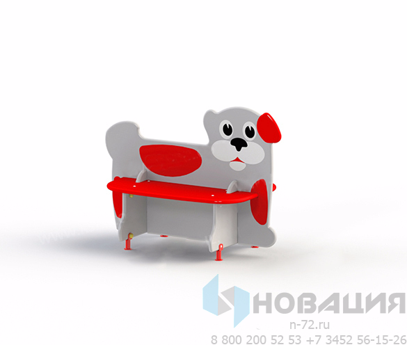 На двухсторонней скамье можно отдохнуть после прогулки. Тематически оформленная перегородка разделяет сиденья с закругленными углами. Элементы конструкции соединяются пазами. На опорах 4 металлических подпятника.