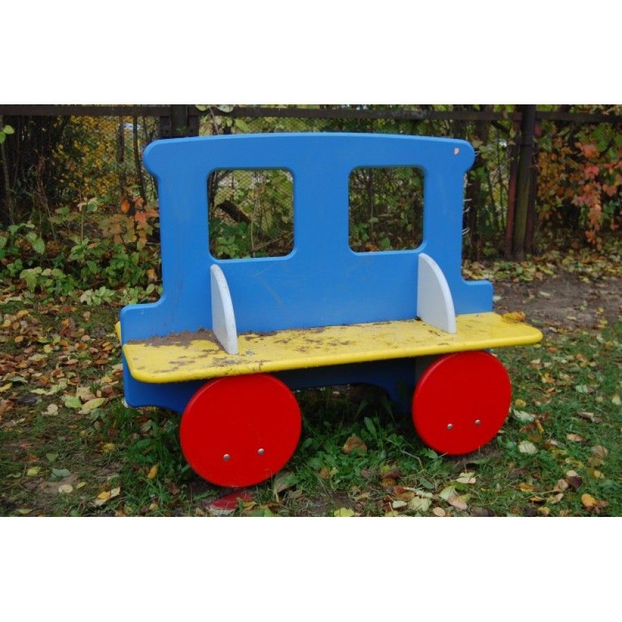 2-хсторонняя скамейка выполнена в форме вагона. Углы сиденья закруглены, по центру проходит фигурная перегородка с 2-мя прорезями-окошками, которая служит спинкой. Опоры конструкции дополнены 4-мя накладками в виде колес.