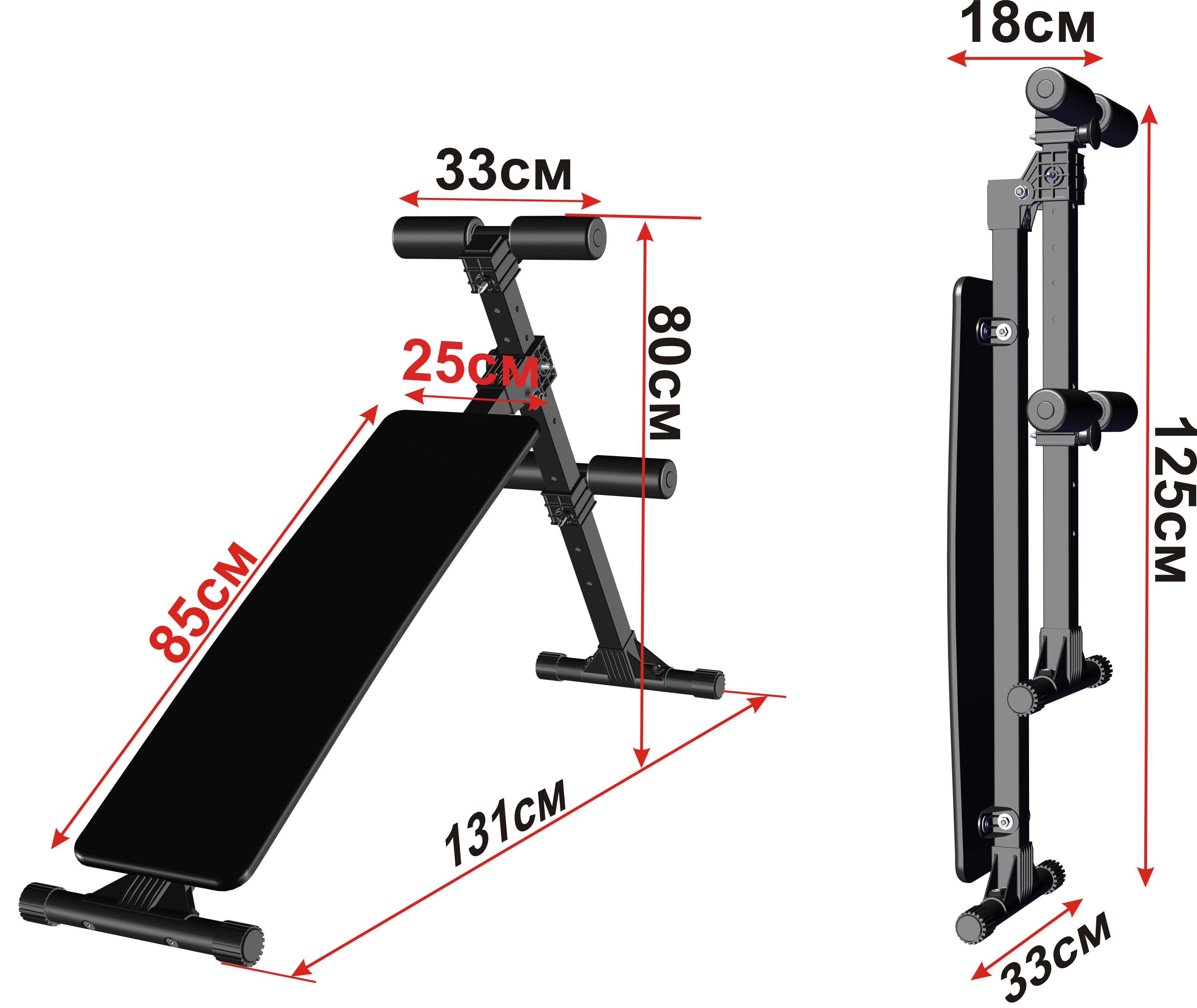 Наклонная скамья оснащается валиками для закрепления ступней ног. Торцевые опоры подстраиваются под неровности пола. Угол наклона тренажера изменяется в пределах: 15, 25, 35 градусов.