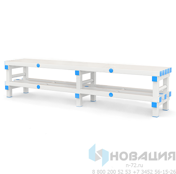 Скамейка для спортзала или бассейна состоит из 2-х секций. Жесткий ПВХ не деформируется под воздействием влаги. Мебель опирается на 4 ножки с продольными и поперечными перекладинами. Торцы реек прикрыты заглушками.