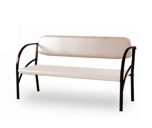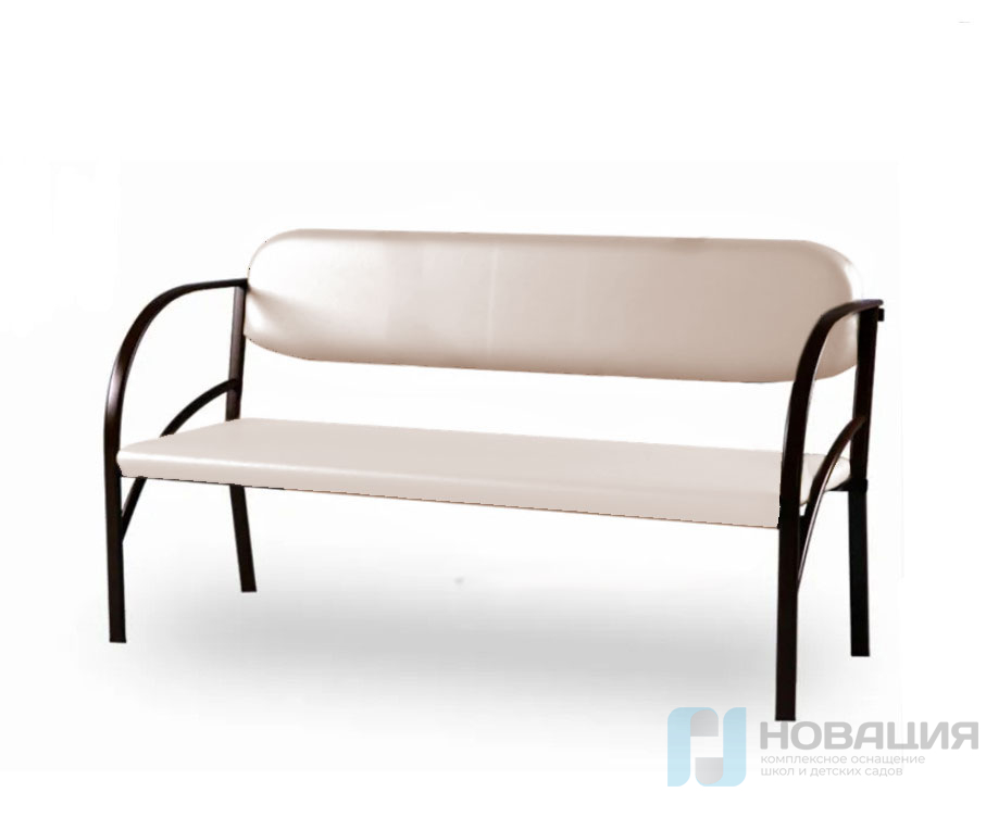 Скамья оснащена мягкими сиденьем и спинкой. Отсутствуют острые углы. Размещается на четырех опорах, на концах которых установлены заглушки. Каркас изготовлен из электросварной трубы.