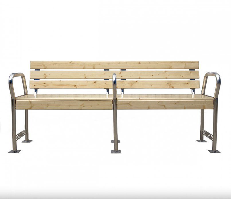Скамья оснащена спинкой и тремя завышенными подлокотниками, которые могут использоваться людьми с ОВЗ для дополнительной опоры.