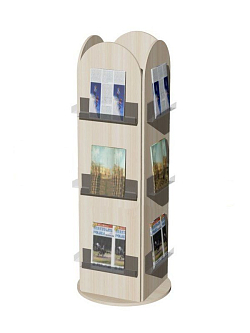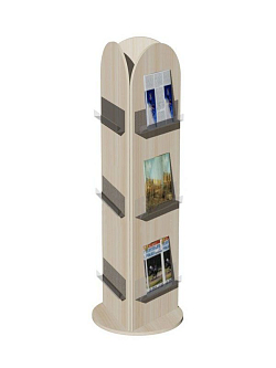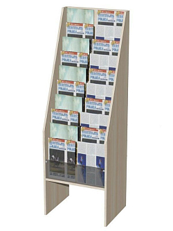 Стеллаж для периодической литературы оснащается наклонными отделениями. Выставочные экземпляры удерживаются при помощи металлических бортиков. Специальный механизм трансформации позволяет легко переводить дверцу в горизонтальное положение. Ручка-полка на дверце Г-образная металлическая. В открытом положении дверца фиксируется горизонтально. Корпус стеллажа с прямоугольным основанием и цоколем изготовлен из ЛДСП.