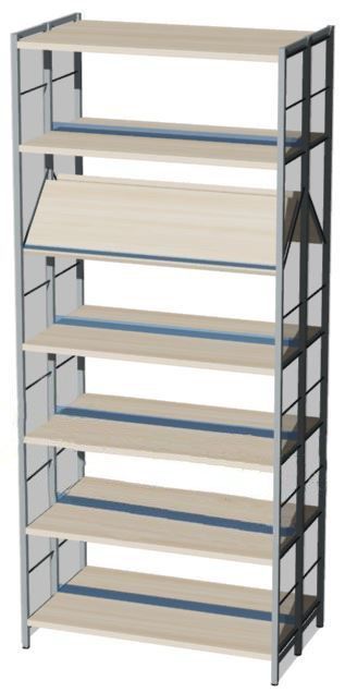 Полки из ЛДСП закрепляются на металлическом каркасе. Боковые стороны стеллажа усилены рамкой жесткости из трубы сечением 25х25 мм. Прямоугольная поверхность полки оснащена ограничителем. Продольная перегородка из оргстекла помогает упорядочить литературу.