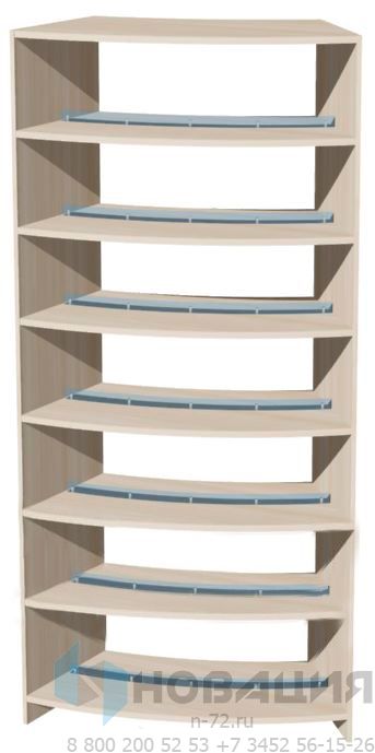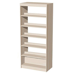 Опоры шкафа регулируются. Конструкция из ЛДСП оснащается прямоугольными полками в количестве 7 шт. Открытые отделения вмещают книги для хранения и выставок. Стеклянные ограничители удерживают экземпляры в вертикальном положении.