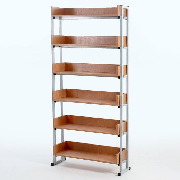Стеллаж для современного информационно-библиотечного центра стоит на опорах-полозьях. Прочная конструкция оснащена металлическим каркасом и 6-ю прямоугольными полками из ЛДСП.