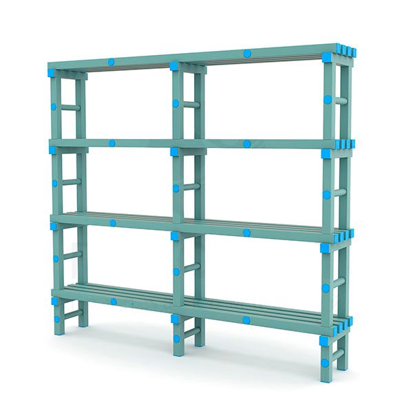 Стеллаж на каркасе из профиля ПВХ используется при любой погоде. Гигиеничный материал не поддается действию влаги или температуры. 3 пары опор соединяются перекладинами. На 4-х полках можно разместить принадлежности для плавания.