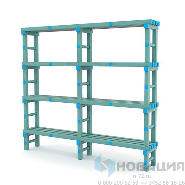 Стеллаж на каркасе из профиля ПВХ используется при любой погоде. Гигиеничный материал не поддается действию влаги или температуры. 3 пары опор соединяются перекладинами. На 4-х полках можно разместить принадлежности для плавания.