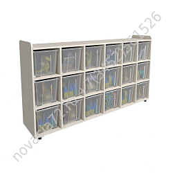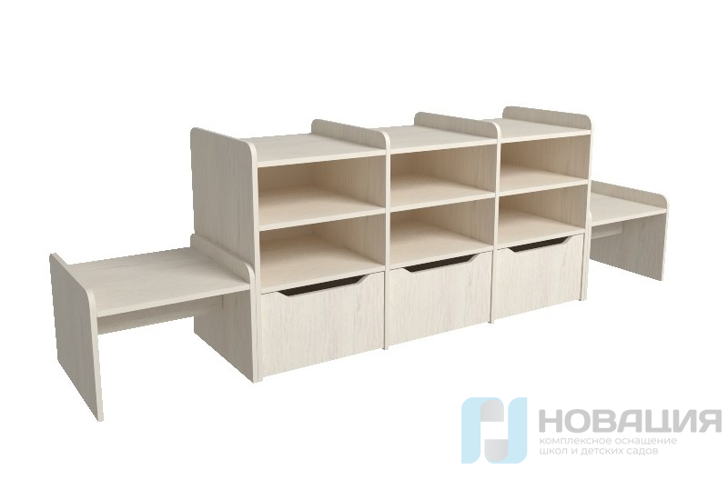 Вместительный стеллаж для ДОУ позволяет размещать игровой и развивающий материал в доступном месте для детей. У стеллажа есть два стола по бокам, при необходимости они могут использоваться как полки.