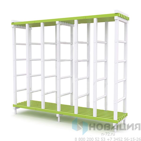 В стеллаже 6 вертикальных отсеков для спортивного инвентаря. Здесь можно хранить аквапалки, доски, коврики для йоги, водные тренажеры. Стенки секций оснащены перекладинами. Топ служит полкой. Опоры стационарные. Материал не выгорает, краска не смывается.