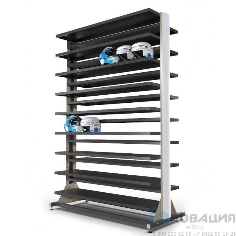 На горизонтальных полках хранятся шлемы разнообразных форм. Допускается хранить в просторных отделениях спортивную обувь. Влагостойкие поверхности покрыты порошковым покрытием.