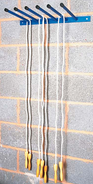 Стеллаж состоит из 3-х уровней (полочек), предназначенных для хранения разного вида мячей. Для подвешивания канатов и обручей по бокам конструкции представлены 8 крючков (по 4 с каждой стороны). Для облегчения передвижения стеллаж установлен на 4 поворотных колеса.