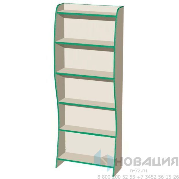 Книжный стеллаж на фигурных опорах размещается в современном информационно-библиотечном центре. Стеллаж оснащен 6-ю полками. Волнообразные края боковых экранов смягчают строгий конструктивный облик.