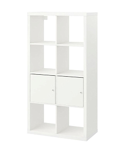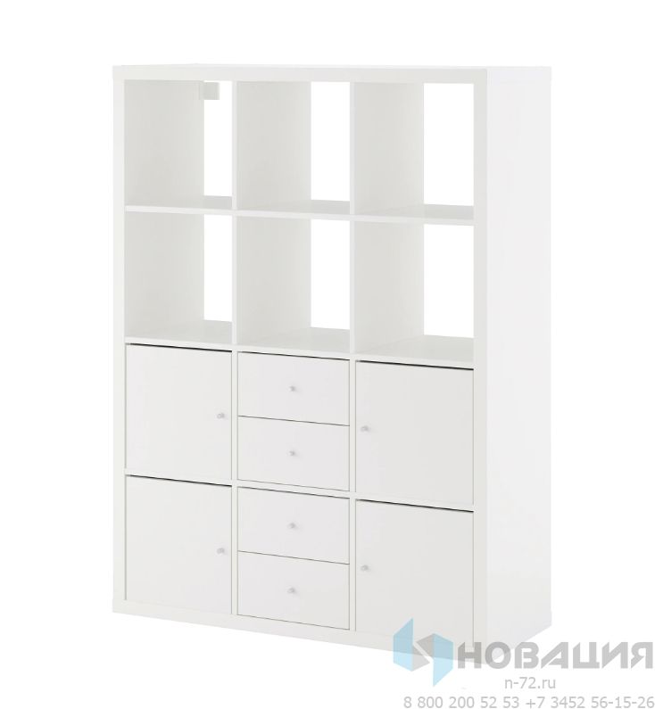 Шкаф состоит из 6-ти полуоткрытых отделений, 4-х вставок с дверцами и 2-х вставок с парами ящиков. Полки рассчитаны на максимальный вес в 13 кг. Шурупы, дюбели, саморезы приобретаются отдельно. Навесы для крепления к стене есть в наборе.