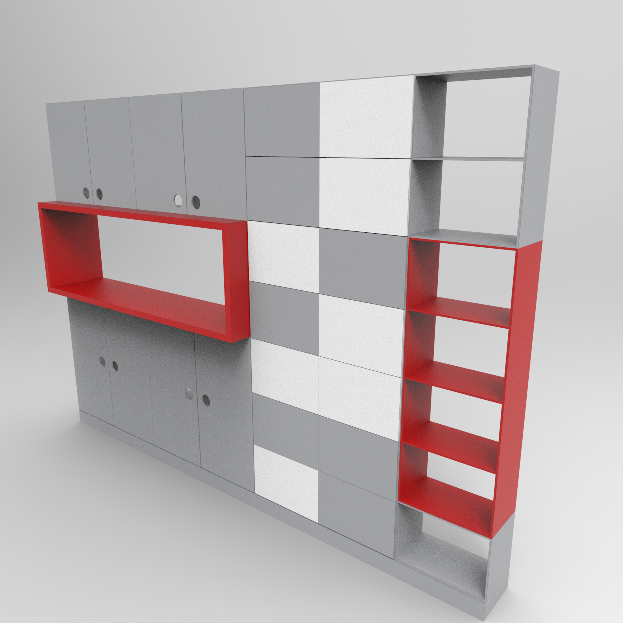 Левая часть корпуса представлена закрытыми отделениями с прорезями (d 80 мм) в 2-створчатых дверцах, а также просторной нишей. Сквозная ниша вмещает книги и оборудование, открывая доступ к предметам с обеих сторон. Закрытые отделения делятся на 2 части (вверху) или на 3 (внизу) .