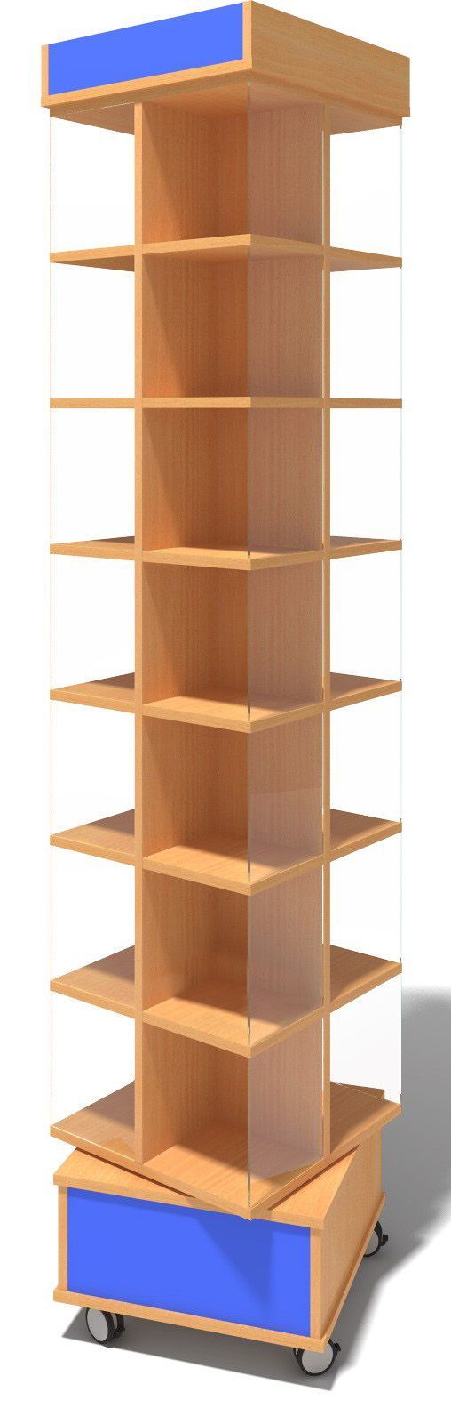 В центральной части стеллажа 28 отделений для брошюр, методических материалов, книг небольшого формата. Боковые стенки выполнены из стекла. Витрина вращается. Основание оснащено 4-мя колесными опорами, которые облегчают процесс перестановки.