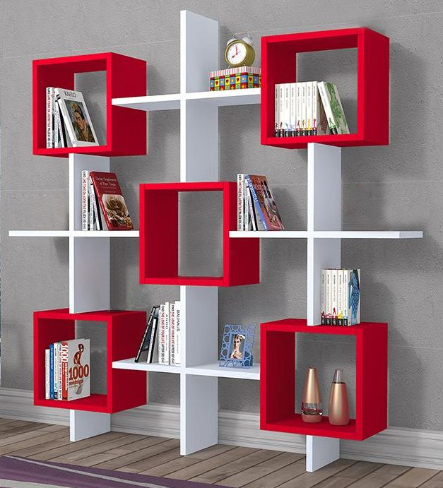 Настенная конструкция составляется из полуоткрытых полок и квадратных ячеек с нишами.