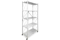 Стеллаж состоит из четырех полок, высоту которых можно менять. Полка рассчитана на нагрузку в пределах 30 кг. На концах опор установлены подпятники, которые предотвращают повреждение напольного покрытия.