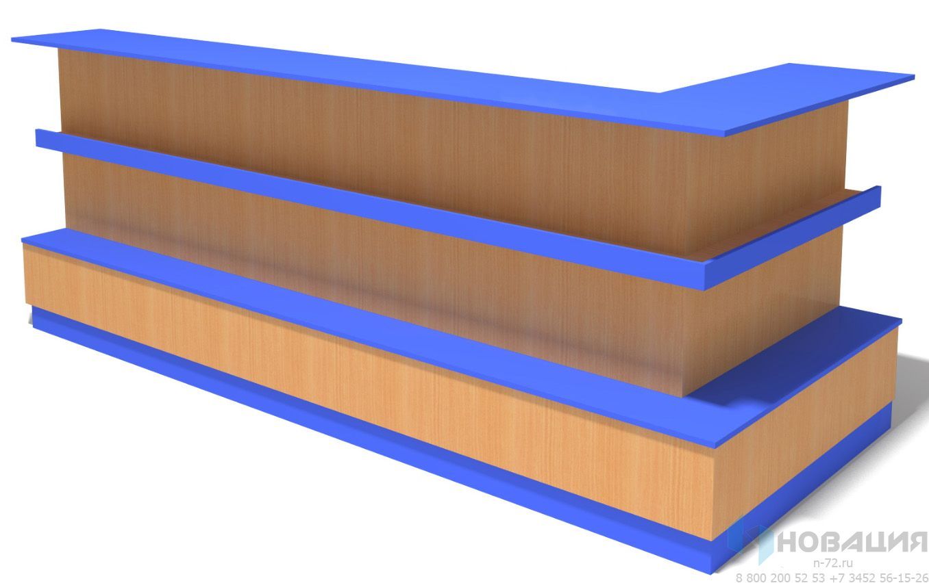 Угловая конструкция подстраивается под габариты помещений. Стойка состоит из 3-х ярусов, которые уменьшаются в размерах от нижнего к верхнему, и 3-х полок для демонстрационных материалов.
