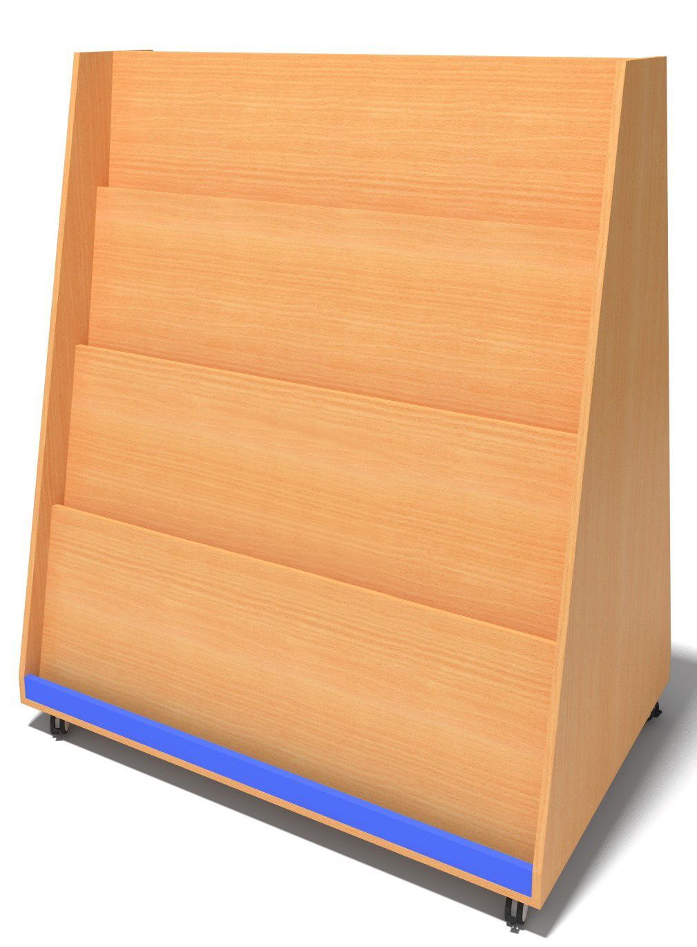 Витрина оснащена колесиками для простоты передвижения. Газеты, проспекты, книги расставляются на 4-х наклонных ярусах стеллажа.