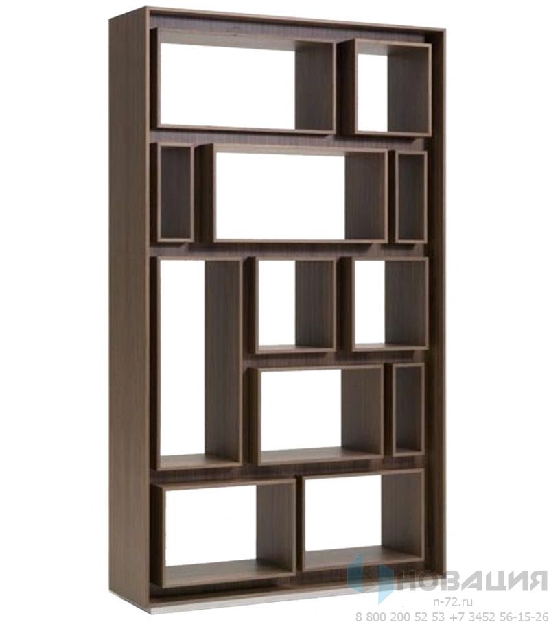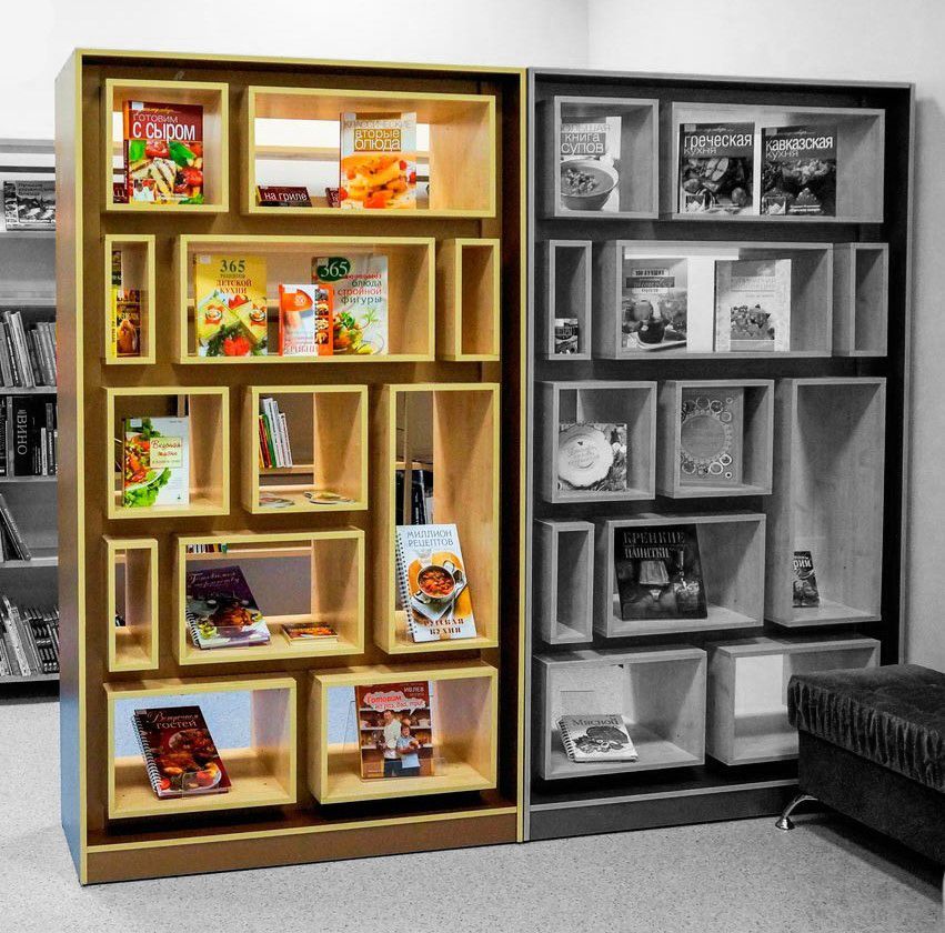 Прямоугольный корпус оснащается рядами из 2-х или 3-х ниш произвольной ширины. В отделениях расставляются образцы книг и таблички. Доступ к полкам открыт с обеих сторон, поэтому стеллаж можно использовать как перегородку для зонирования.