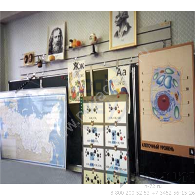 Стенд экспозиционный, выполненный в виде навесной панели, которая размещается над классной доской, предназначен для демонстрации учебного материала: карт, таблиц, иных наглядных пособий, необходимых для проведения урока.